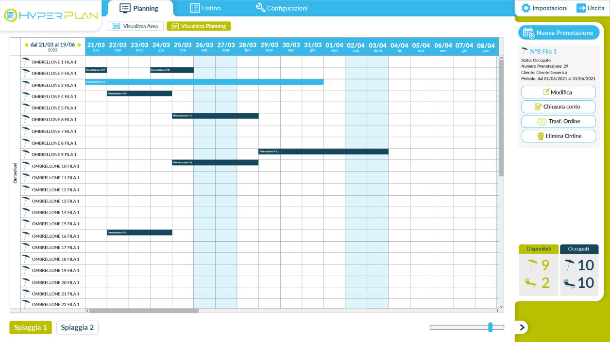 HyperPlan è il software per la gestione di prenotazione di servizi, studiato per ottimizzare il flusso dell’attività lavorativa a partire dalla prenotazione fino al pagamento dei servizi usufruiti dal cliente. Idoneo per la gestione di stabilimenti balneari, b&b, piccoli hotel, centri estetici e parrucchieri.